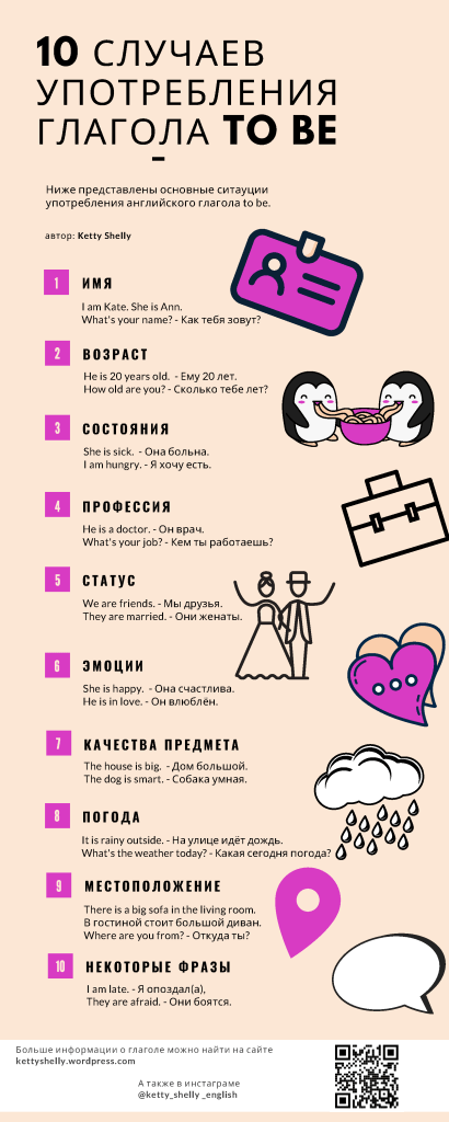 Существует несколько основных ситуаций, в которых употребляется английский глагол быть. Для удобства я перечислила их в таблице ниже.